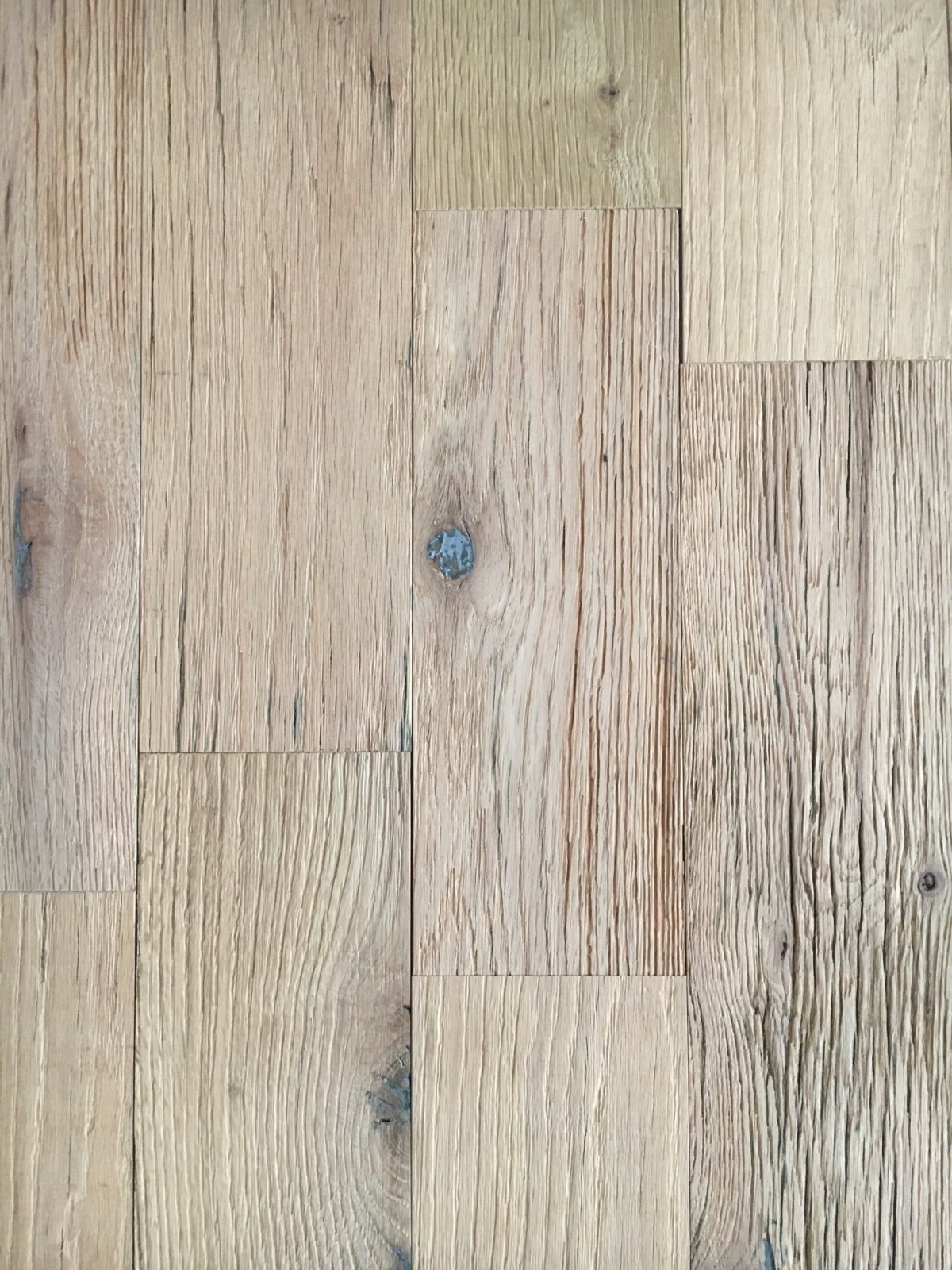 オーク古材の表面からわずかに内部に入った部分を使用し、古材感を残しつつも上品に仕上げました。木目を浮き立たせ、さらにサンディング処理でなめらかさを持たせることにより古材でありながら手触りの良いフローリング材です。