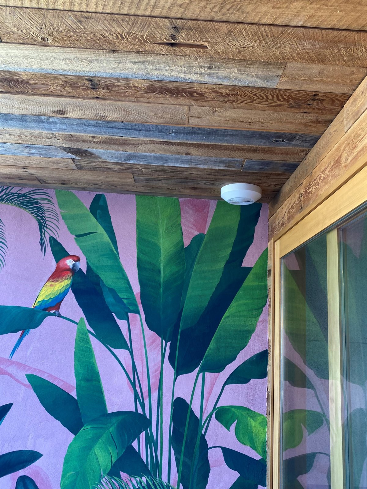 横の壁の カラフルなペイントと対照となり、古材が引き立ってますね