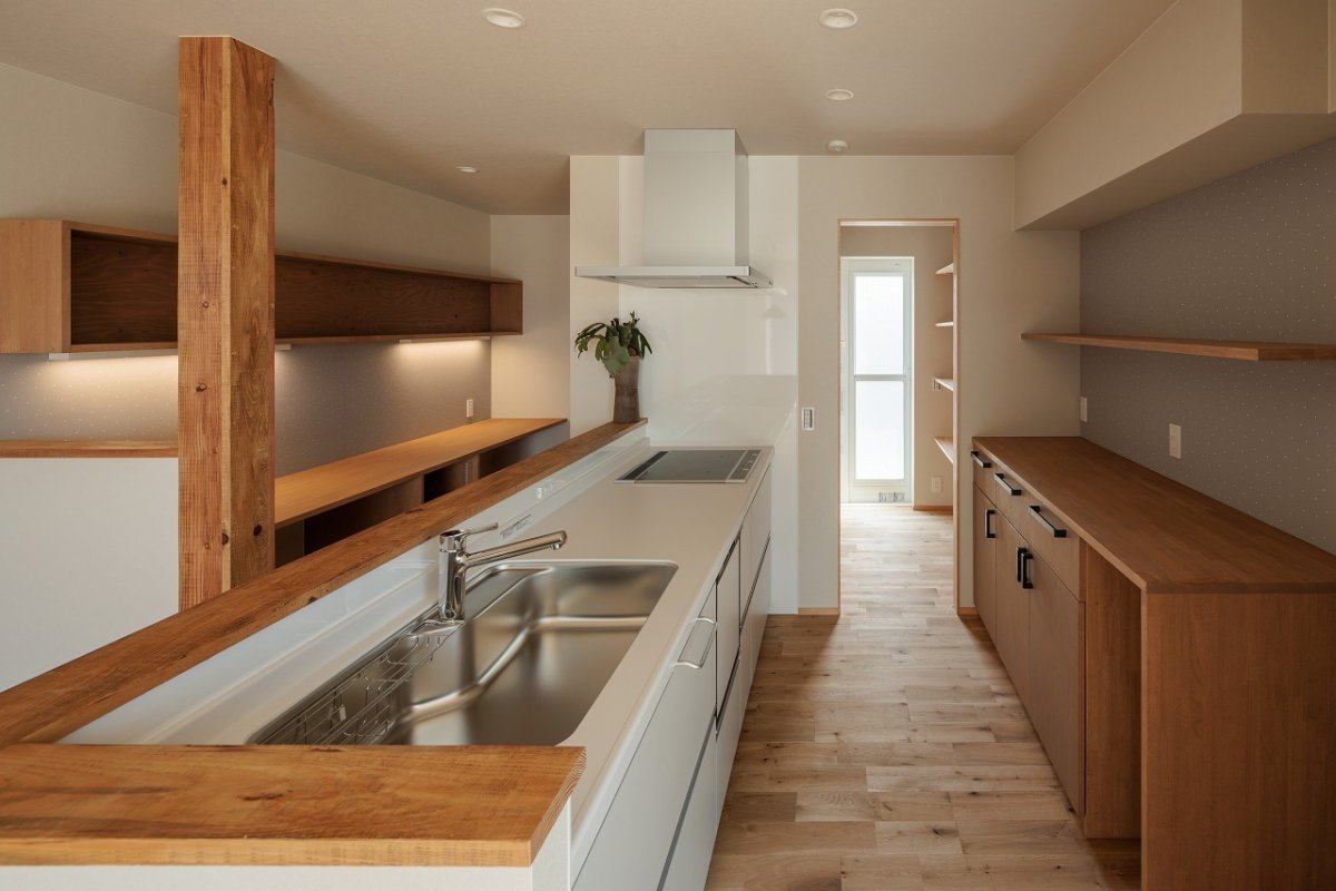 キッチンの笠木と柱にモクジスボードを貼っていただいております。