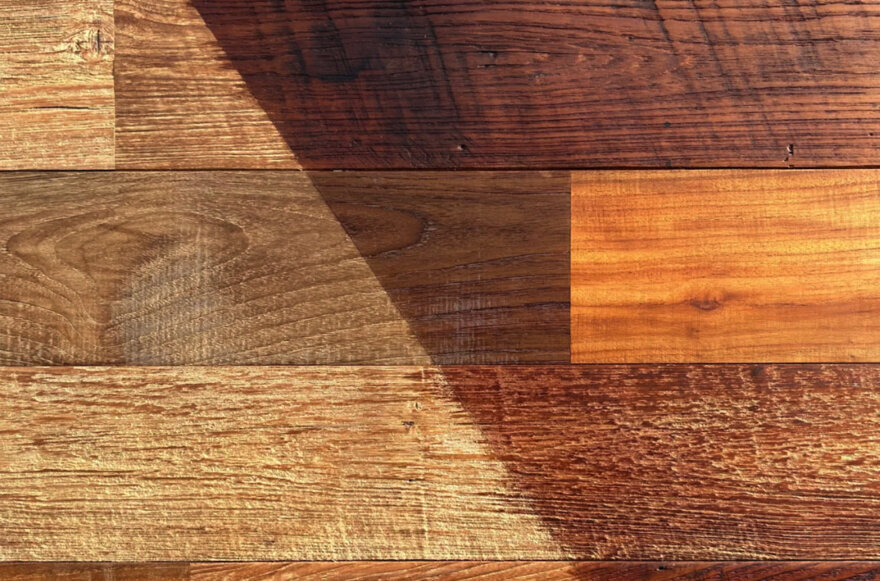 古材には数十年の時を経て刻まれた傷、色ムラ、木目の深みがあります。