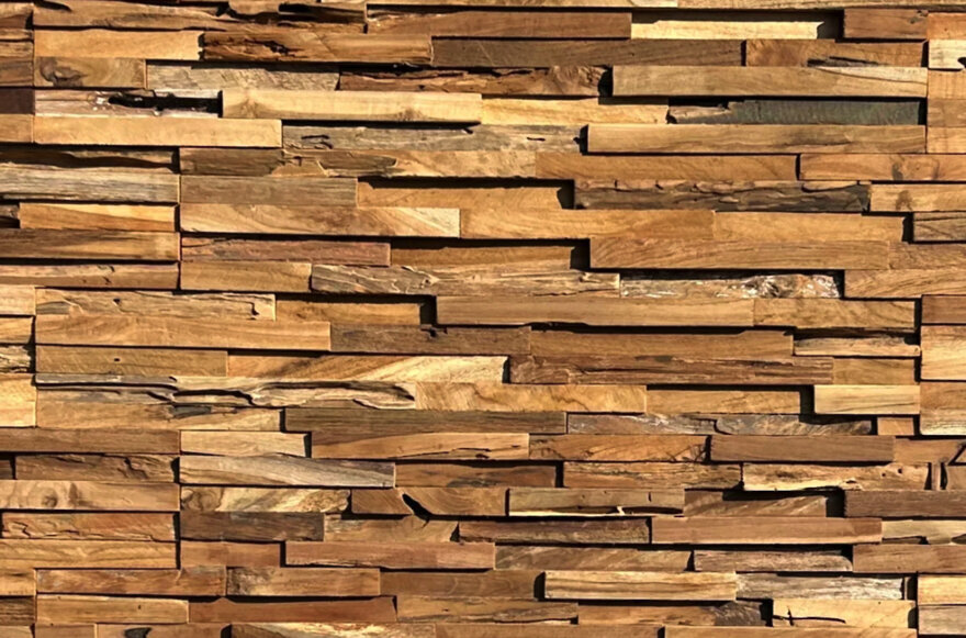 壁一面に、様々な色味が混ざり合った古材パネリング(板材)を貼る手法です。