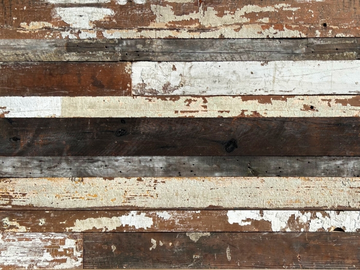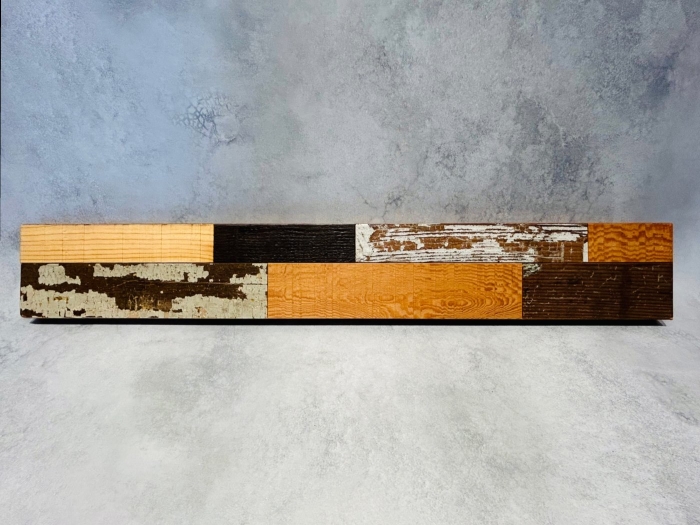 駅舎の古材の表層部分のみをそぎ落として製作した板材です。風雨にさらされて風化した風合いと、メンテナンスのために塗り重ねられたペンキ跡が特徴的です。