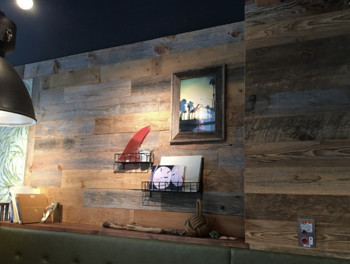 ハワイアンレストランの内装に、不燃古材(商品名:不燃 USボードブラウン)を使用。