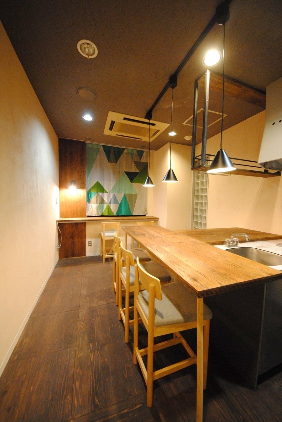 古材を使ったカウンターやペンダントライトで、カジュアルなバーの様な空間を目指しました。広いスペースではないですが、「給湯室」も空間に手を加えれば、「こじんまりと集まる場所」に変えることができます。