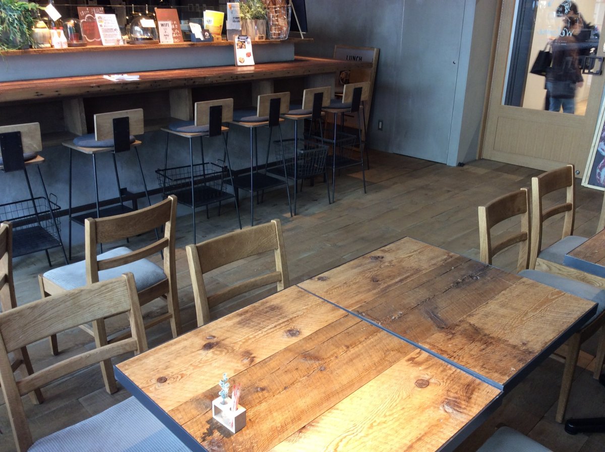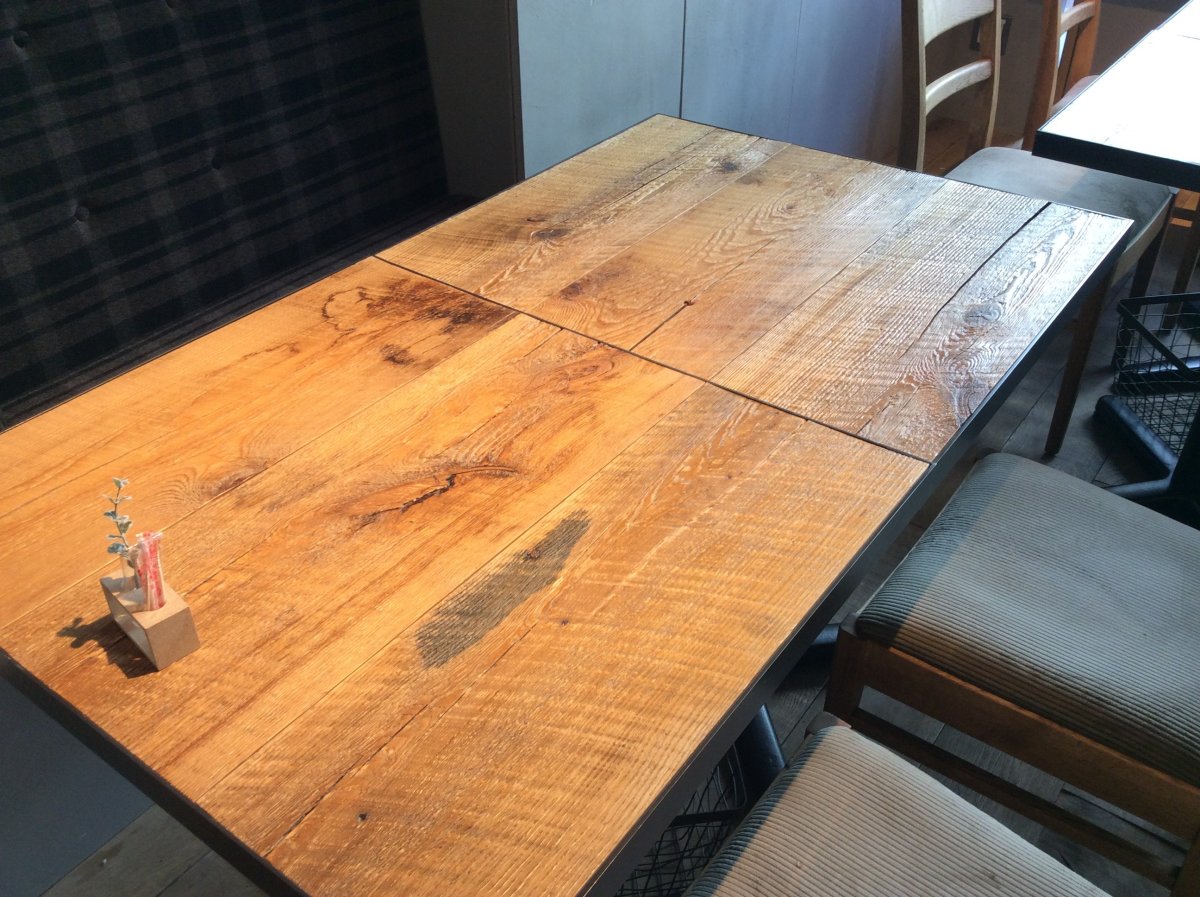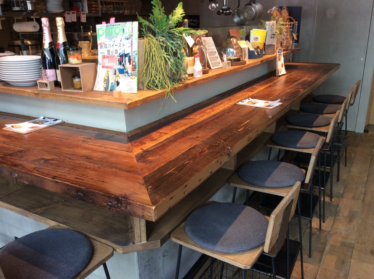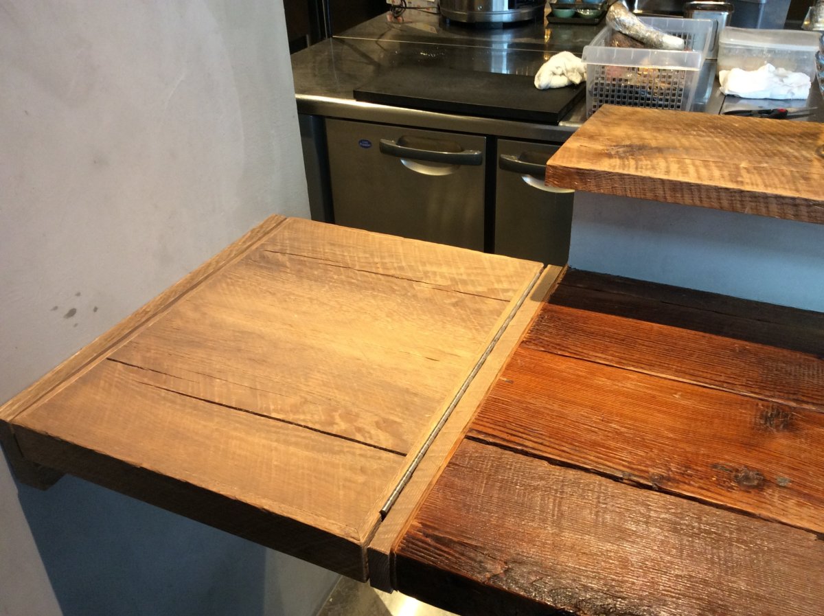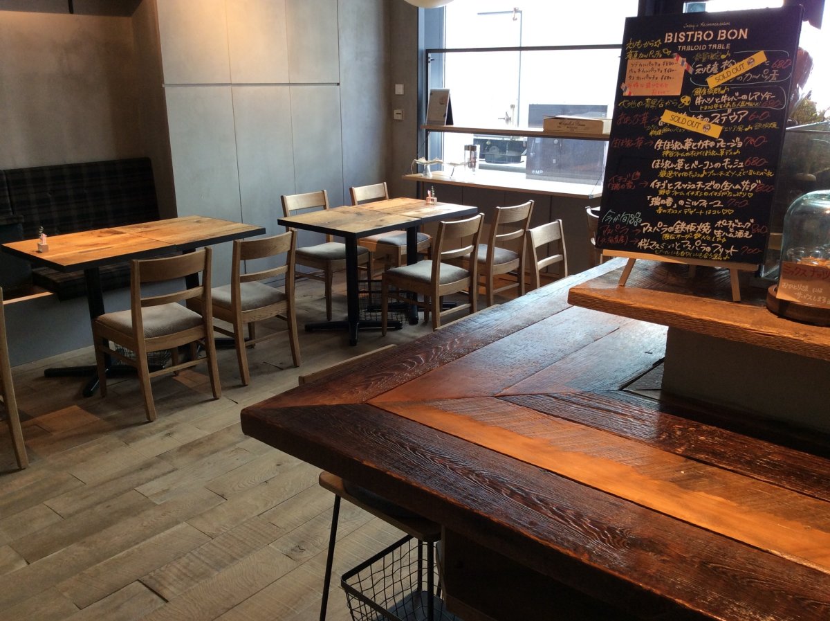 こちらの1階、「大衆ビストロ BON」には当グループの人気シリーズ輸入古材板代表USボード(2インチタイプ)&「USボード(バーンウッド) ブラウンタイプ」幅広プレミアムをご採用いただきました。使用箇所はカウンター天板やテーブル天板になります。