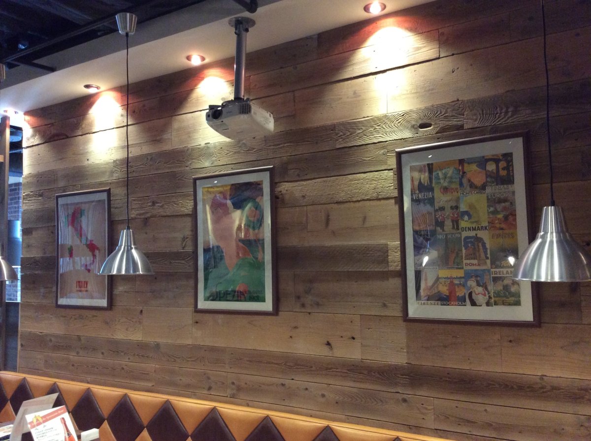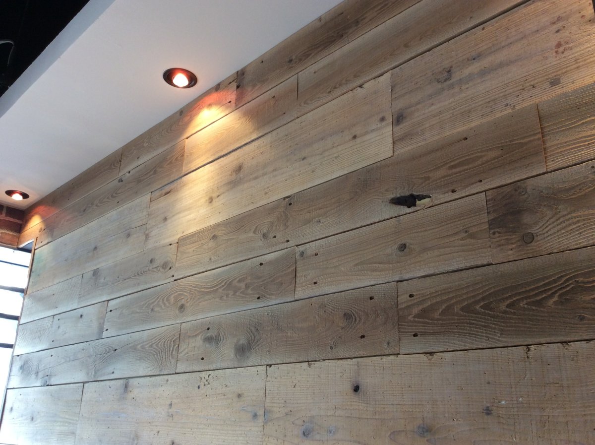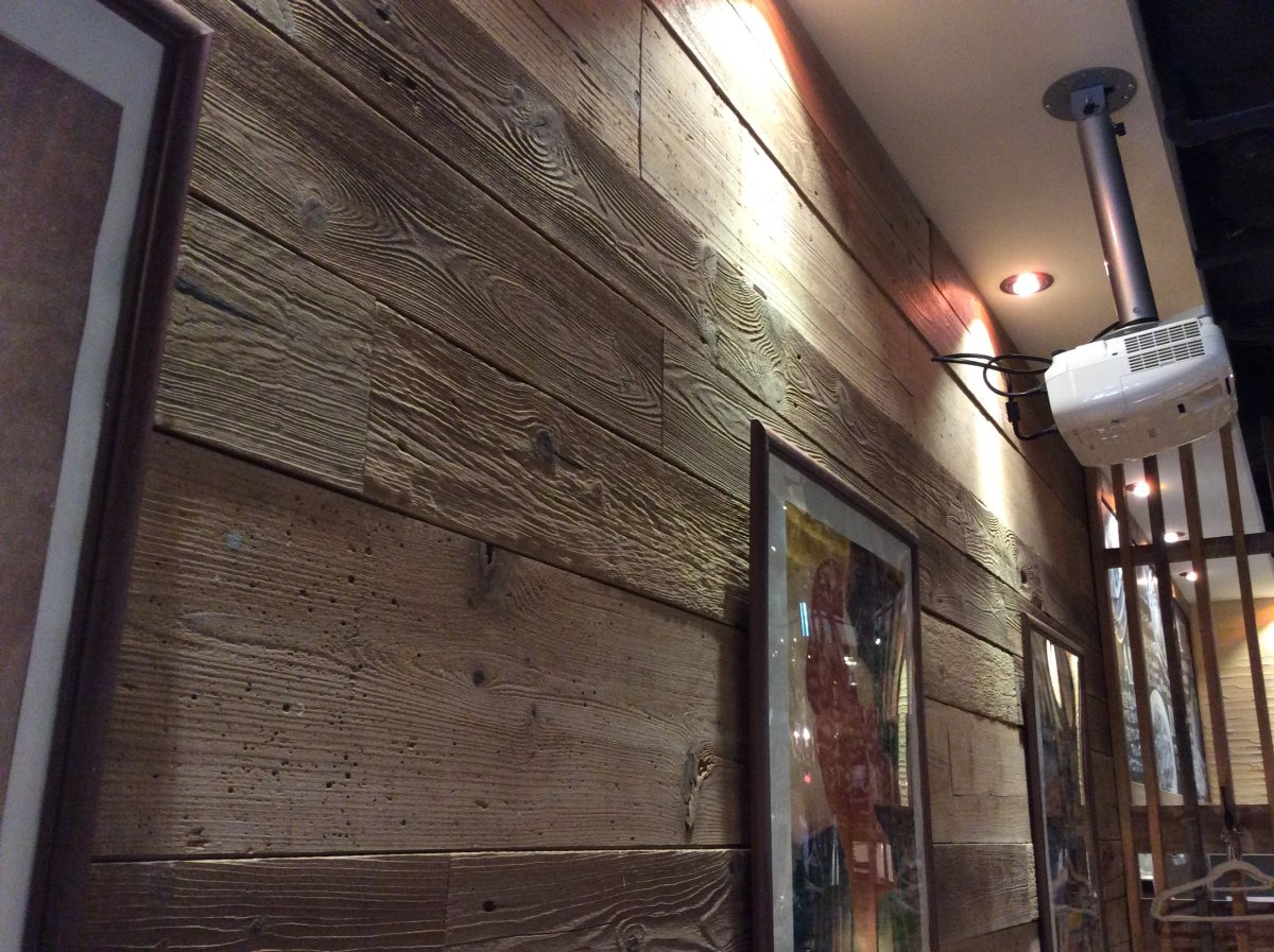 今回こちらの2階フードレストラン、北海道イタリアンバル「ミアボッカ」には古材日和オリジナル不燃古材の「USボードブラウン」そして「ユーズドプレーン」をご採用いただきました。
