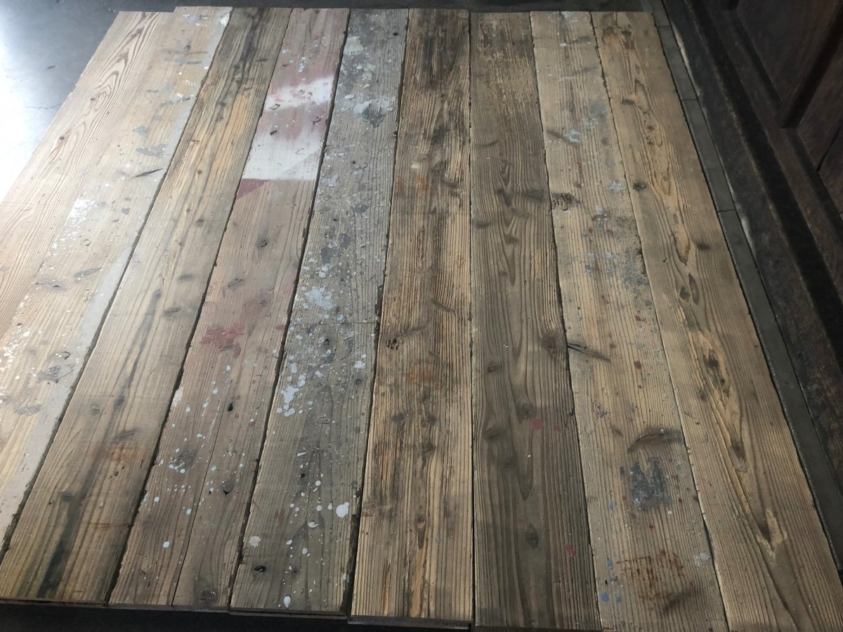 ペンキ、サビ跡、釘穴、表面の痛み、普通なら廃棄処分になるでしょう。