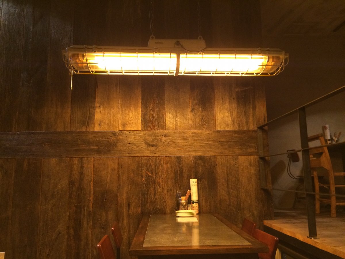 一番奥には小上り席、ここの床材は ユーズドプレーン ( 古材足場板 )35㎜厚!