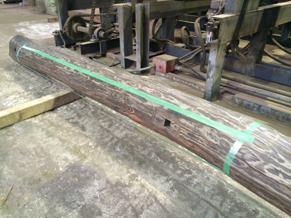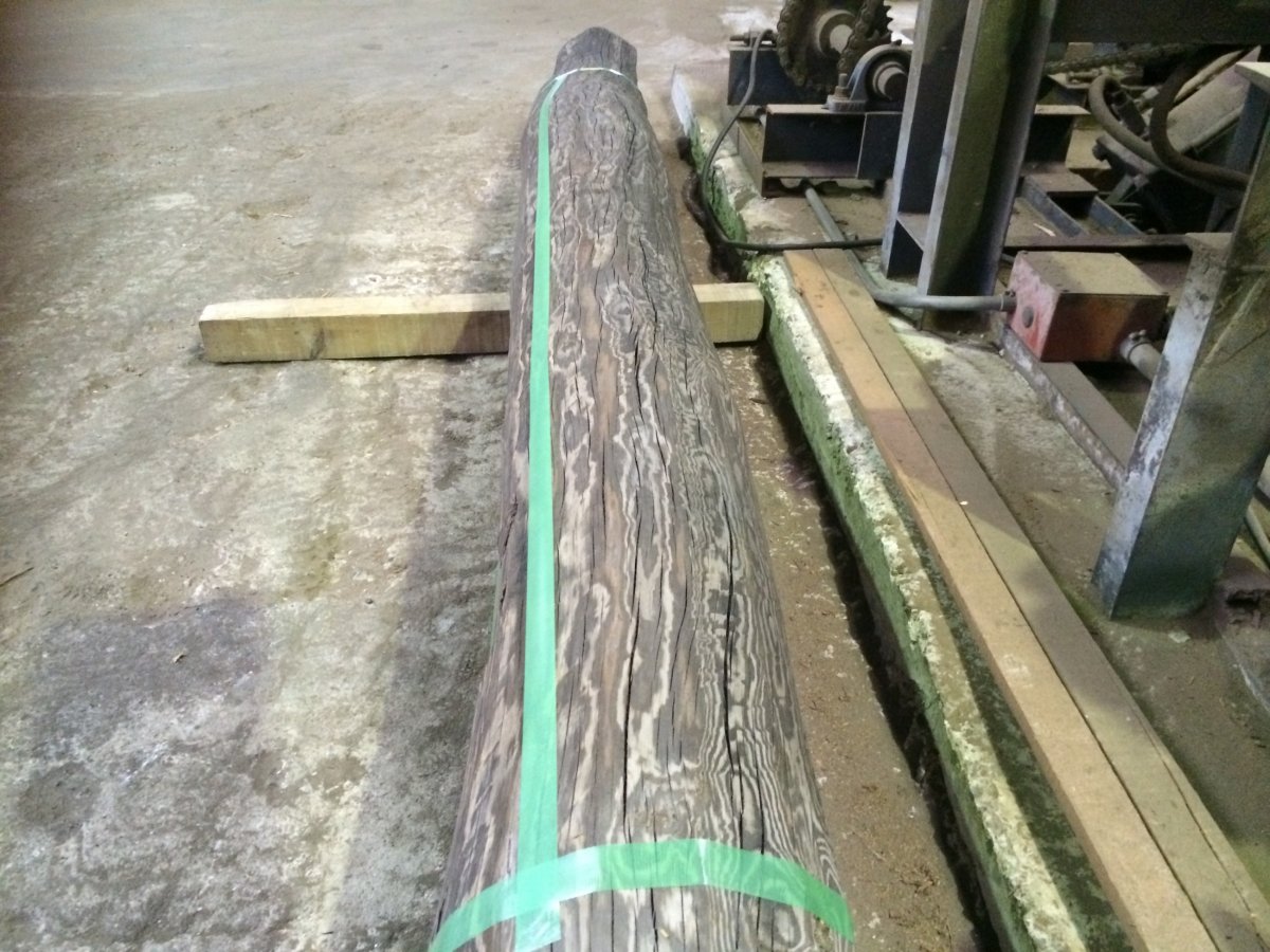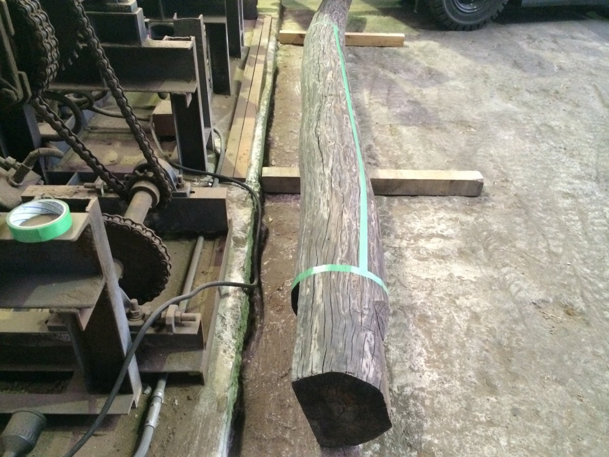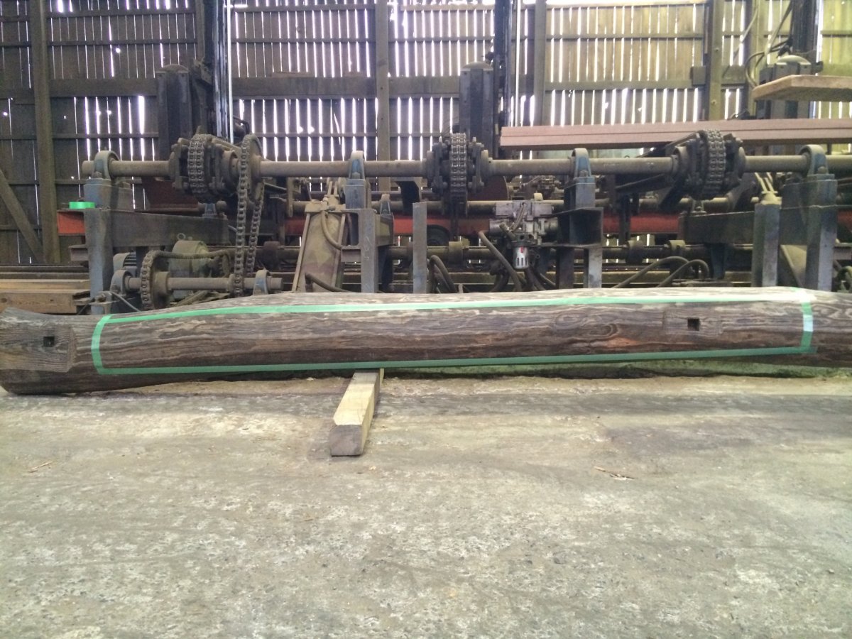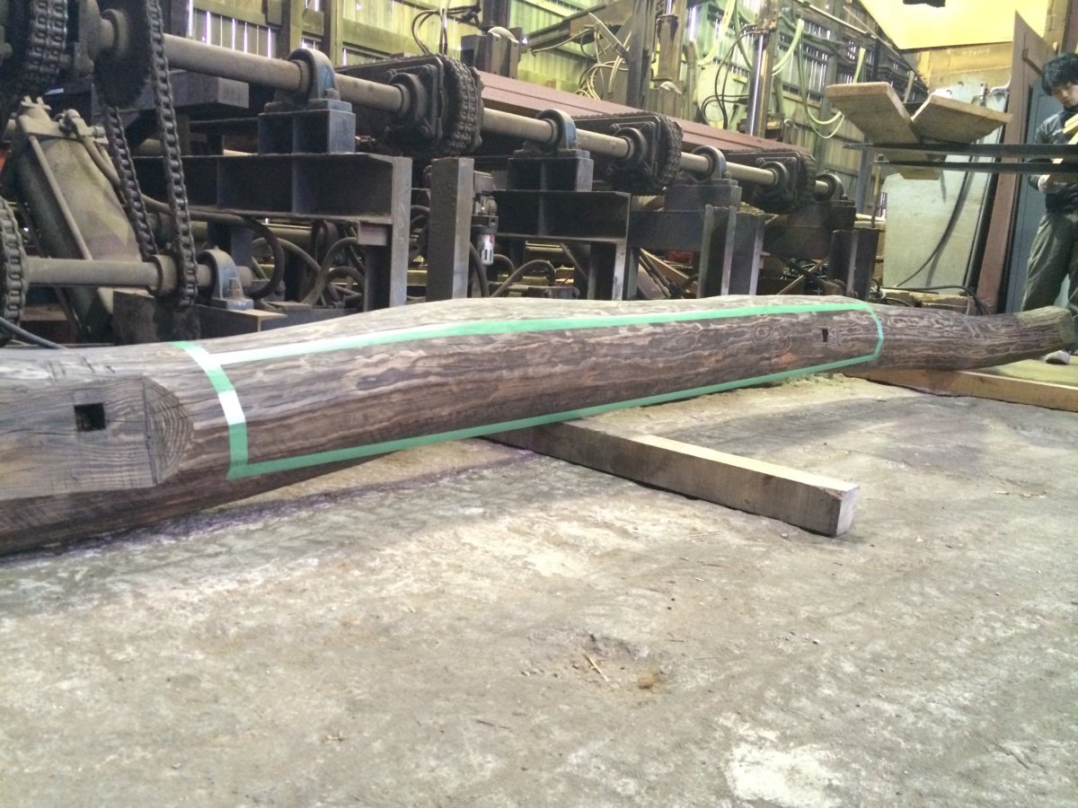 古材のどでかい丸太を料理して、古材の框(かまち)を作ります。