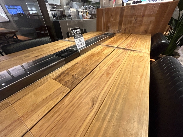 ソフトな古材感ですがテーブルとの相性はばっちりです。