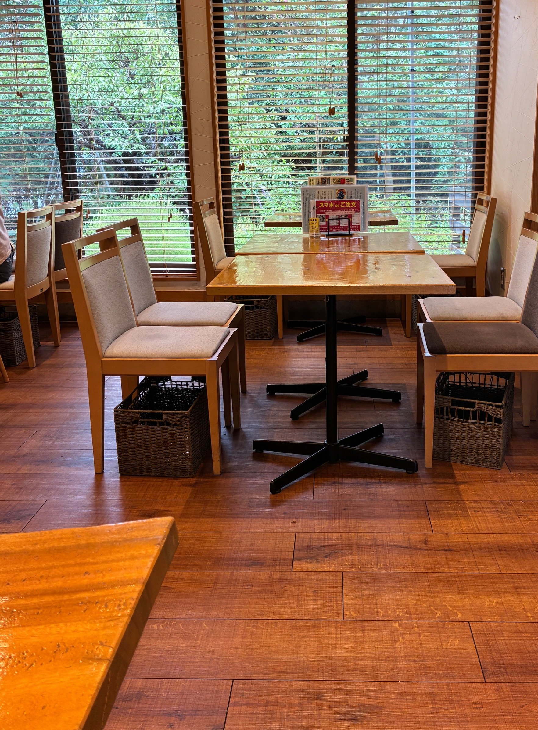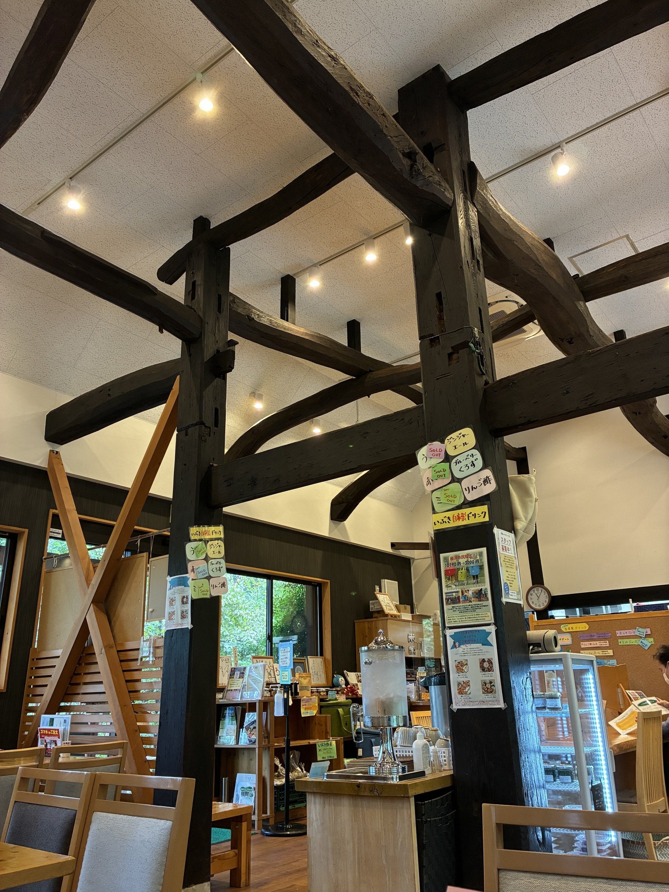 太い梁や柱が存在感を放ち、木の温もりに包まれながら食事を楽しめます。