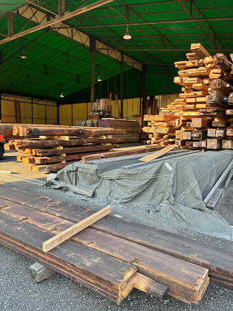 現在、倉庫内の古材をひとつひとつ確認しながら、在庫の整理を進めております。