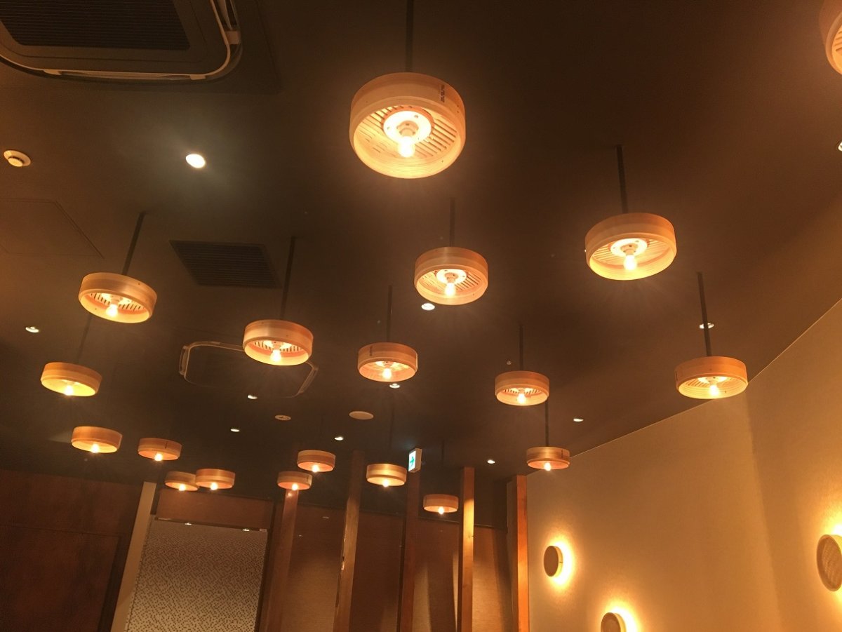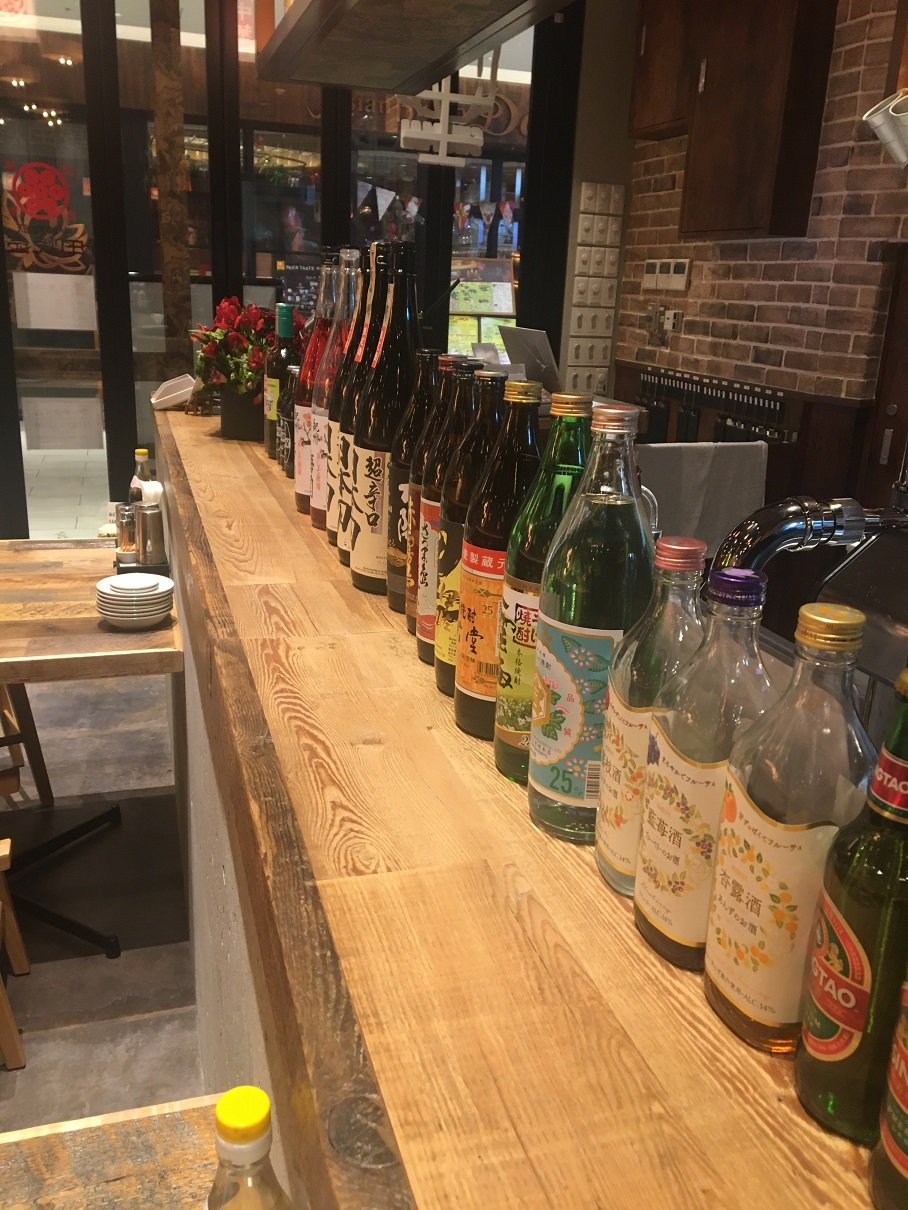 カウンターにはUSボードのブラウン・2インチを。 ボーダータイプのテーブルは大小円形合わせて16台!