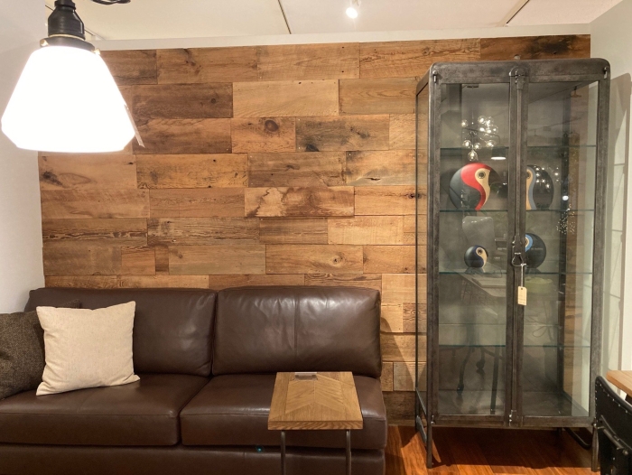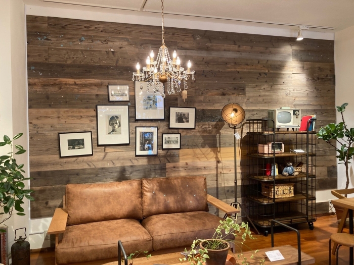 USボード ブラウンに不燃処理を施し、不燃材料として仕上げました。公共施設や百貨店・ショッピングモール・アーケード等の商業施設など、不燃材料の使用が義務付けられている場所においても古材を利用することができます。