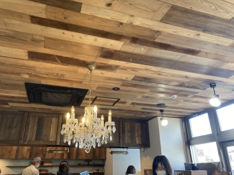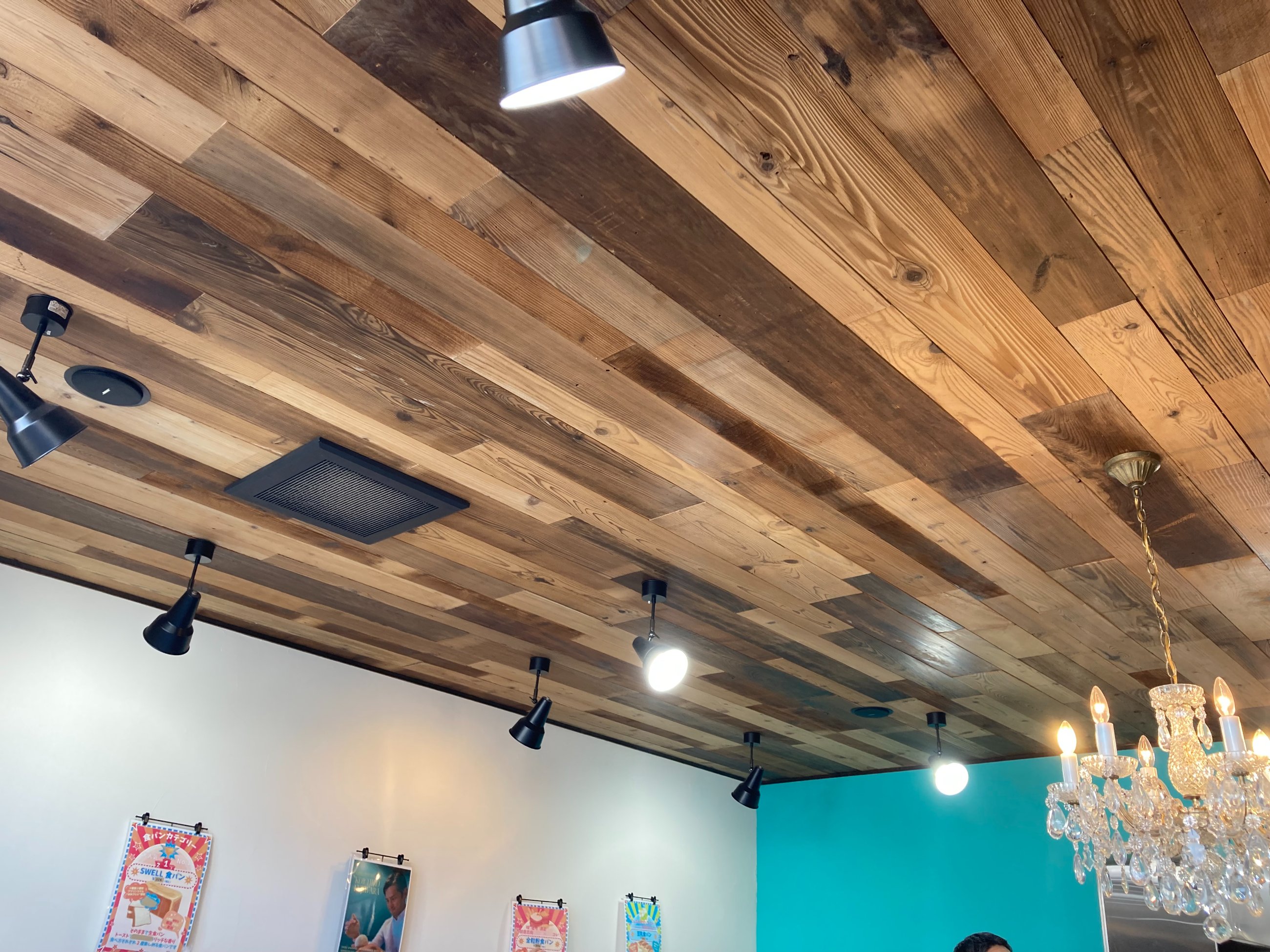 カウンター腰や棚の扉にも古材を使っていますが この度は天井にクラシコ不燃を採用して頂きました。
