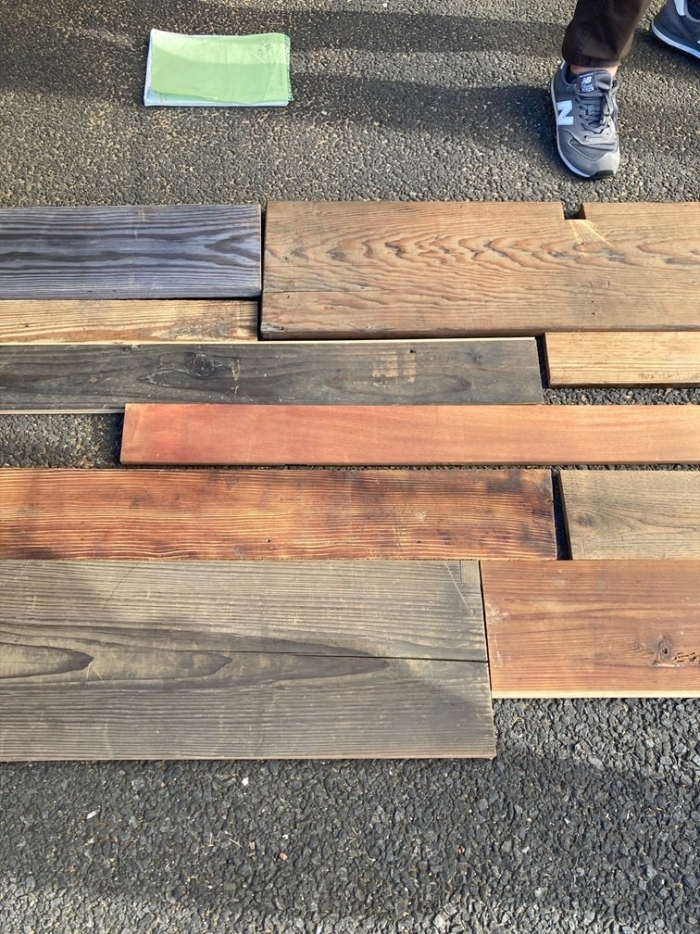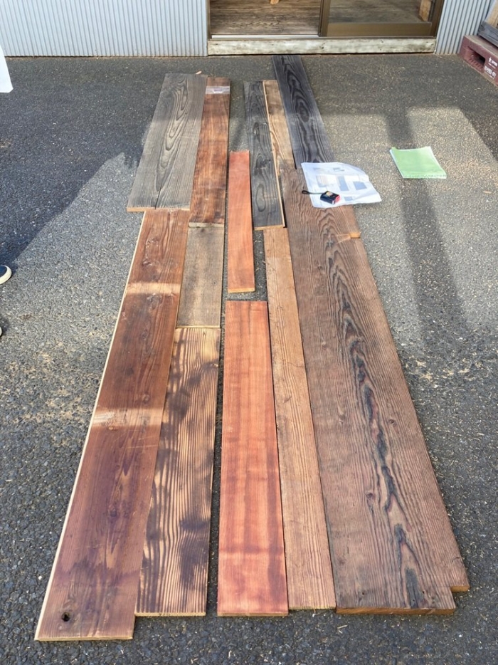 カウンターの腰部分に色んなタイプの古材板をランダム貼りに・・・
