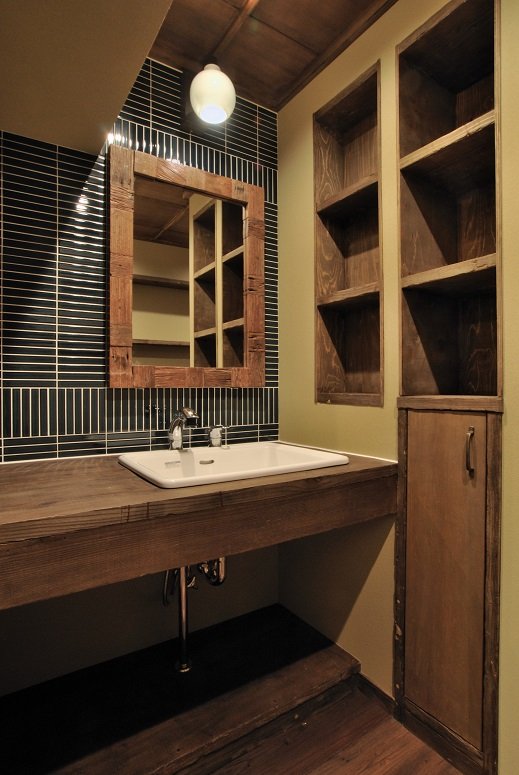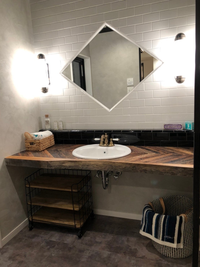 そして 洗面台にミックスハードウッドとimondiオークヘリンボーンを使用した事例