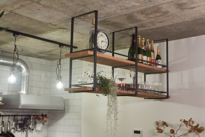 壁に取り付けた板は 綺麗めな国産古材「クラシコ」を カウンターと頭上の棚板は少しワイルドな「USボードブラウン」を使ったもの。 大人しい風合いのクラシコと対照的なUSボードブラウン、その中でも特に独特な節目に力強さを感じる1枚を選んだところに拘りを感じますね。