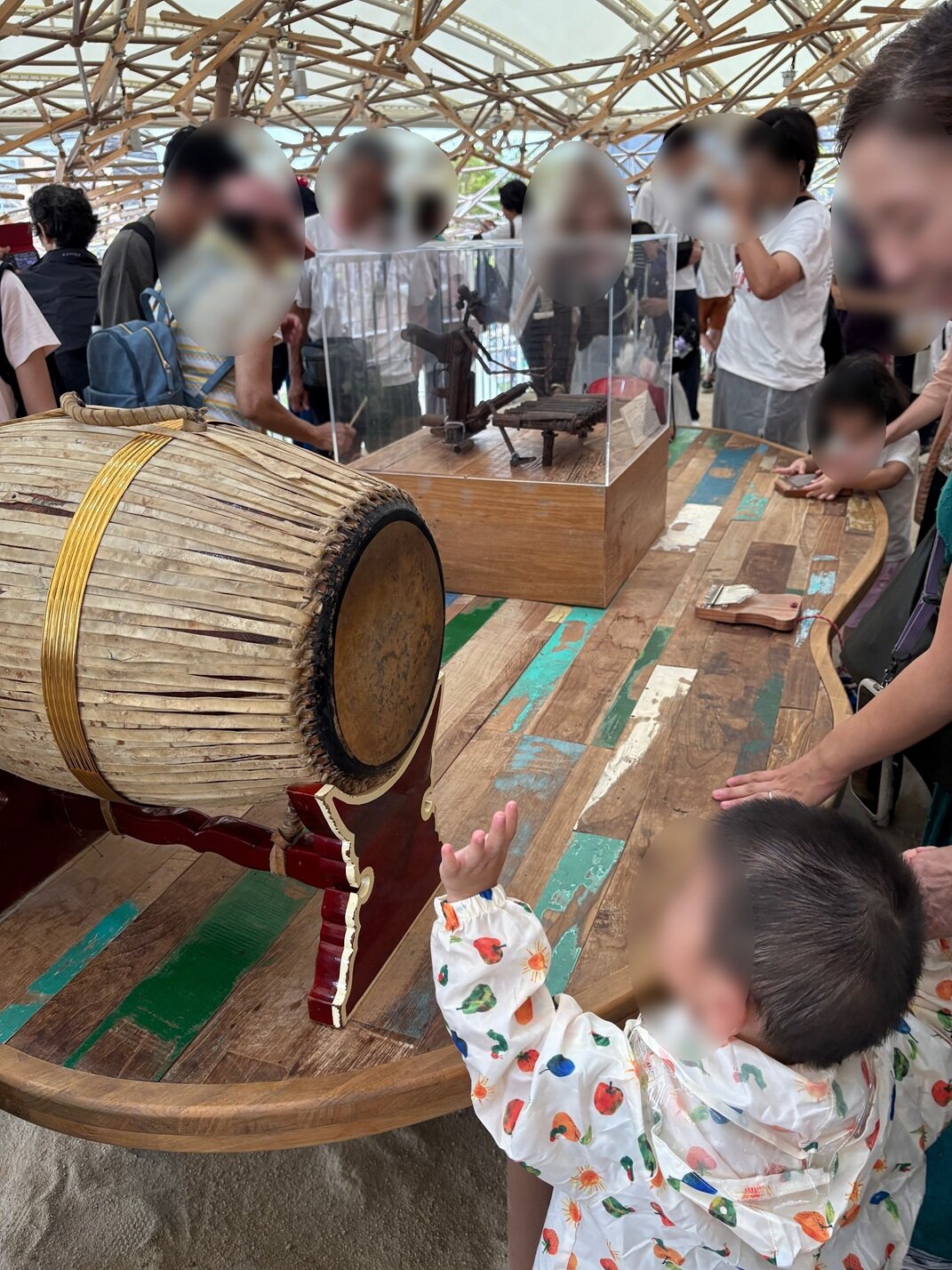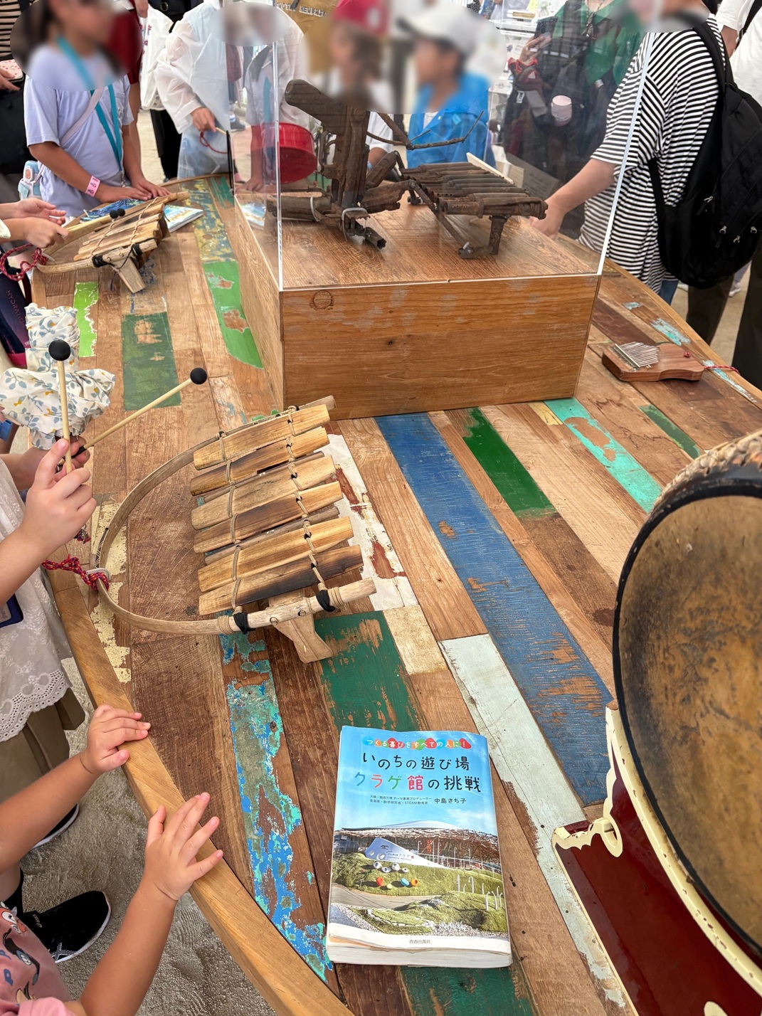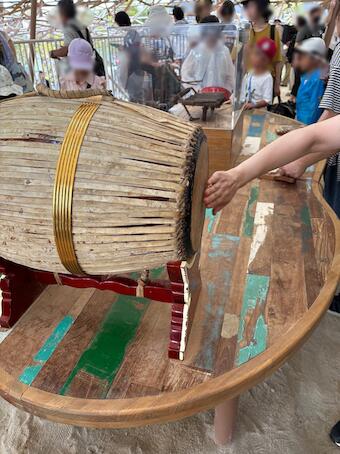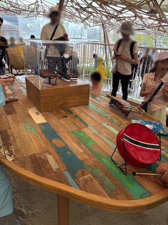 かなりまとめすぎた説明にはなりますが(笑) そんな「体験」できる場所の一部に誰でも自由に触ったり叩いたりできる民族楽器がありまして、それらを載せる大きなテーブルに古材が使われたのでした。