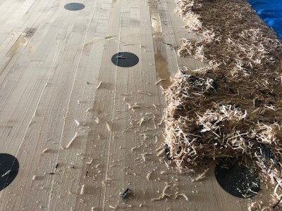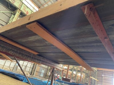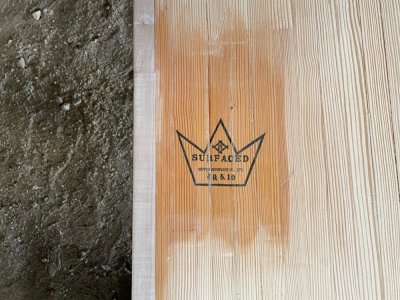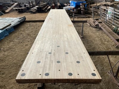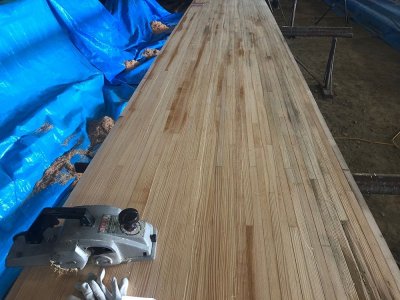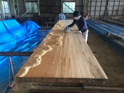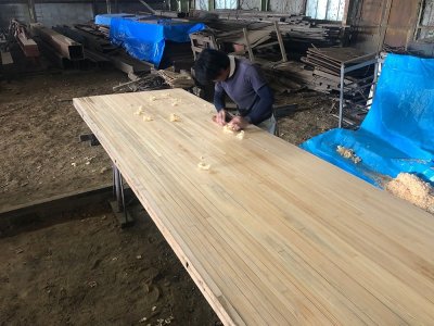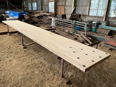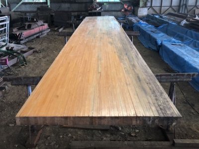 香川県のボウリング場で50年前にレーンとして使われていた材です。解体時にはできる限りカットせず、そのままの姿で引き上げました。樹種はパインとメープルから構成されており、レーンの表面をカンナで削ると美しい木目が現れます。全長7m以上、巾は1m以上、テーブル等の用途に最適です。