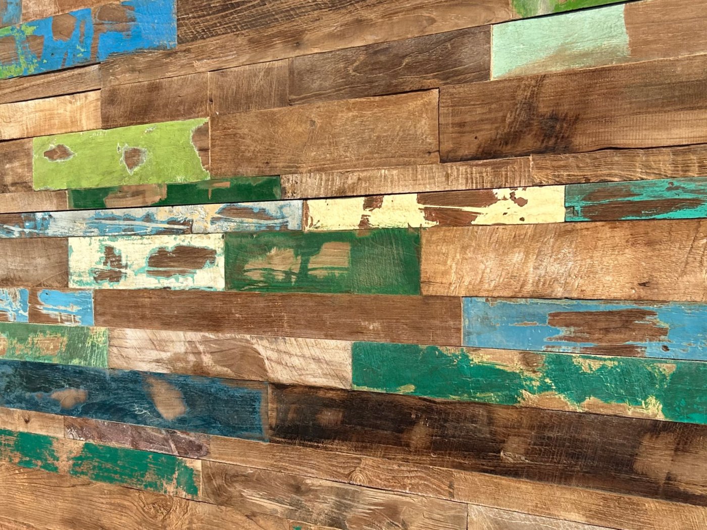 インドネシアの古民家の外壁として使用されていた高級材「チーク」を再利用して製作した商品です。当時の富裕層は住宅を保護する目的で外壁に塗装を施しており、現地特有のカラフルな色合いが特徴です。厚みが薄いため非常に使い易い仕様となっており、壁面や什器など様々な用途にご利用いただけます。