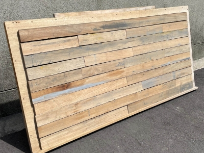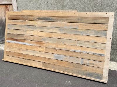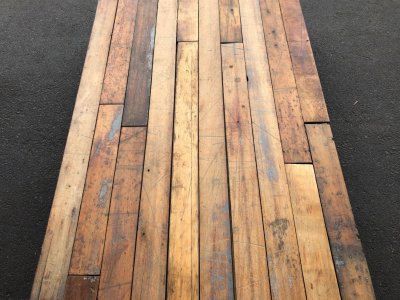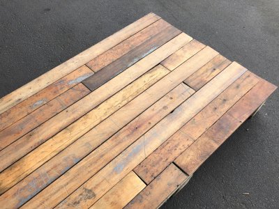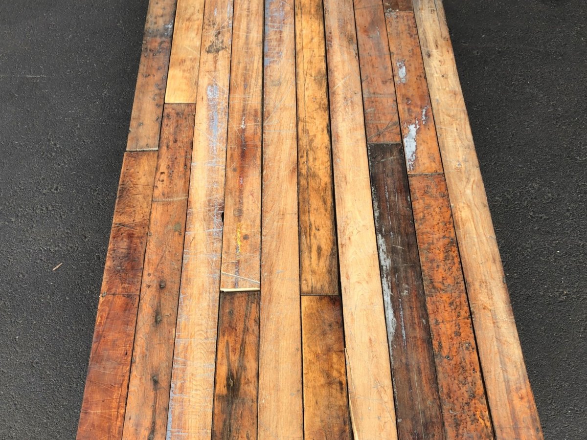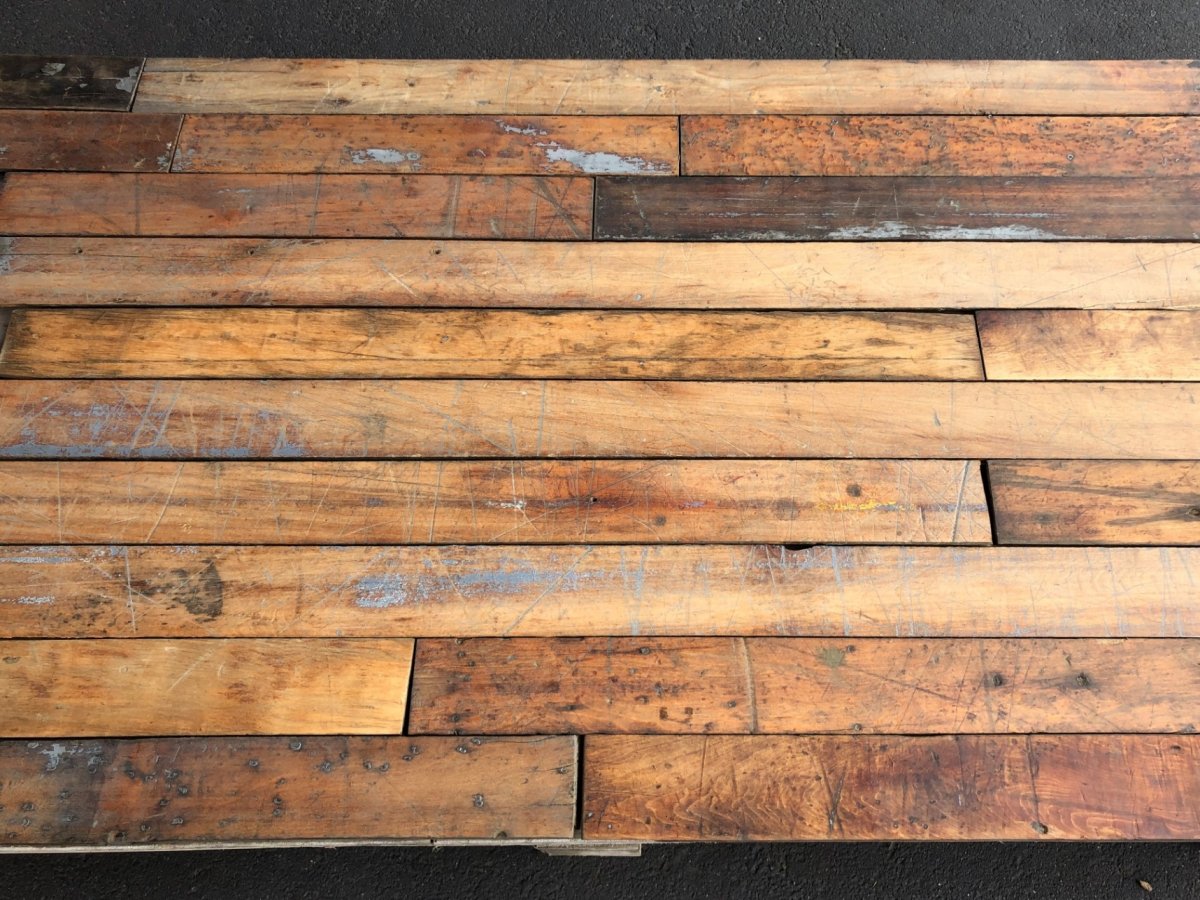 アメリカの鋳鉄工場を主とする工業用工場の床材です。重量物を扱うため耐久性のあるメープル材が使用されています。厳しい工場環境で長年使用されたことによって生み出された重厚感と深みには、そこで働く人たちの風景がよみがえるほどの言葉では伝えきれない歴史と力強さをまとったオーラがあります。