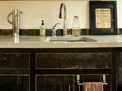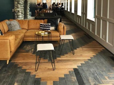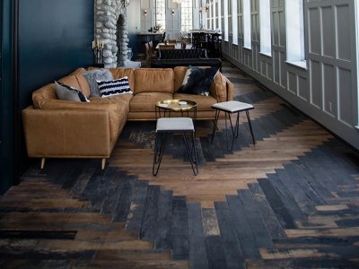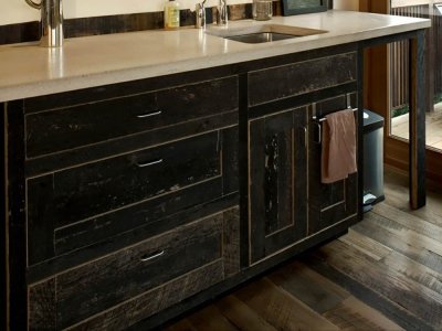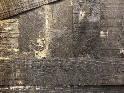 牧場用フェンスとして使われていたオーク材を回収したものです。ブラック色のペイントや強度のあるオーク材が力強さを醸し出します。随所に現れる使い込まれた風合いが、単色の材でありながらも変化のある表情を作り出します。