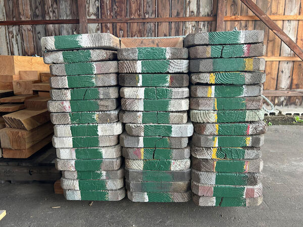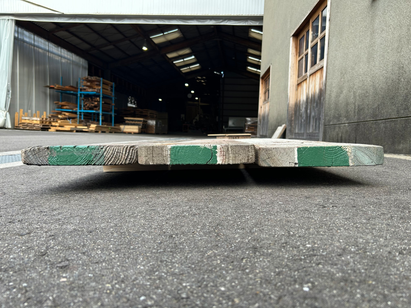 造船の現場において足場板として使用されていた古材です。人や資材の荷重を支えながら、湿気や結露、摩耗といった過酷な環境に耐えてきました。そのため、通常の足場板より厚く幅広で、さらに割れ止めの金具も貫通しています。長年の使用によって生まれた風合いと実用性を併せ持っています。