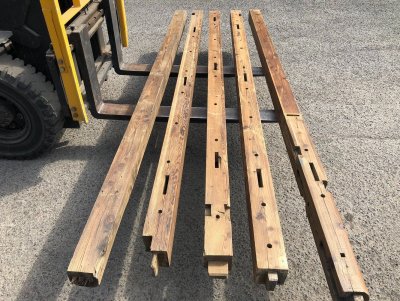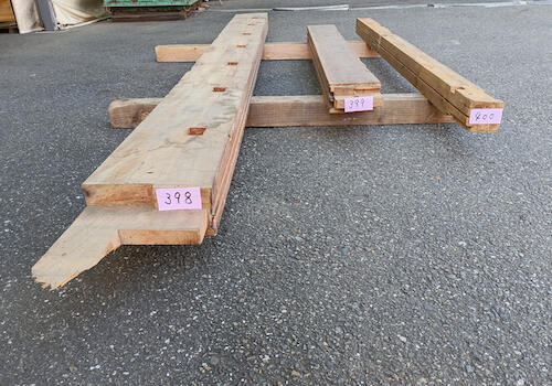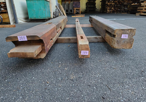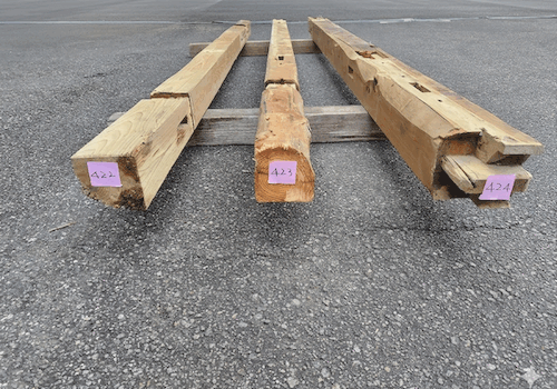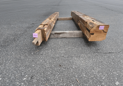 柱材はホゾ穴などの古材ならでは特徴を十分兼ね備え、かつ使いやすいため、非常に人気のある商品です。古民家を支える重要な部材ゆえ梁材とガッチリ組まれており採取が難しい素材ですが、安定供給するため日々コツコツと収集に励んでおります。