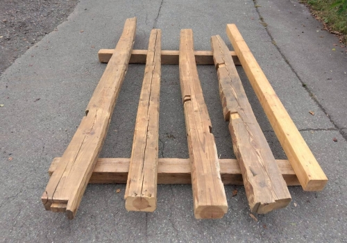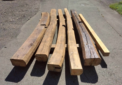 タイコ(太鼓)は、丸太の両面を平らにカットした材料のことを意味します。つまり2面が平面で、残り2面が丸みを帯びた形状のことです。名前の由来は、この断面が和太鼓の胴のような形をしていることから来ています。主に古民家の梁材として用いられ、丸太の自然美を残しつつもすっきりした風合いが特徴です。