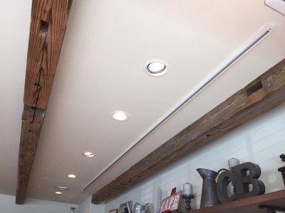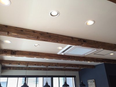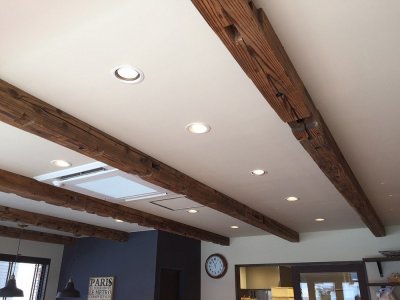 古材を薄くスライスした付梁(つけばり)付柱(つけばしら)です。既存の空間に貼り付けるだけで、最初から古材が埋め込まれているような重厚感ある空間に生まれ変わります。これも古材のもつ本物の質感がそうさせるのです。