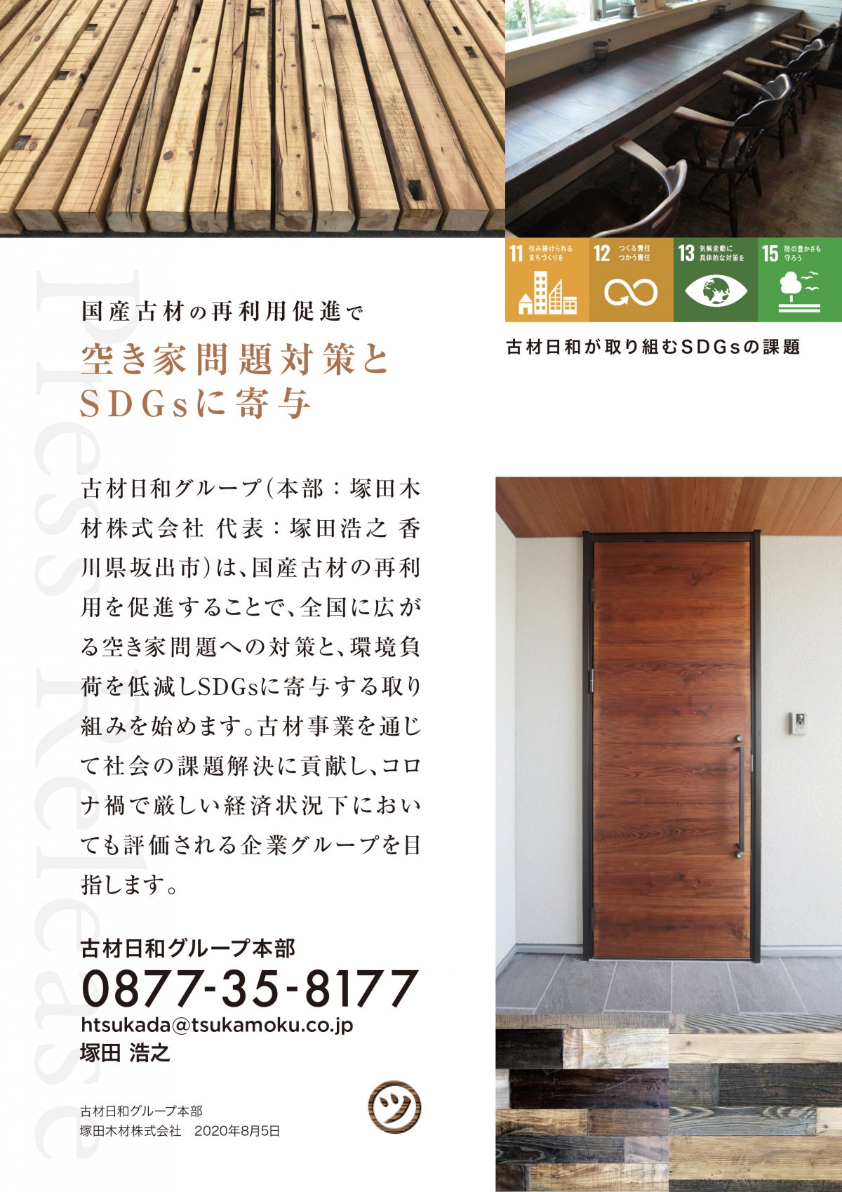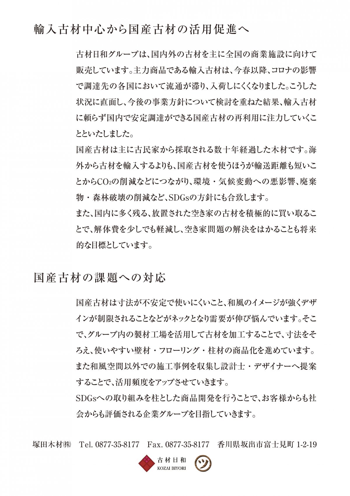 ※古材日和(こざいびより)グループ:古材の収集・販売を目的とした全国5社の木材業者で組織された企業グループ。本部は塚田木材株式会社。ホームページ:www.kozaibiyori.com