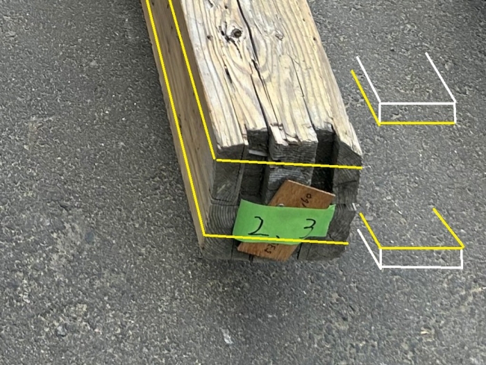 黄色ラインでカット、135x25x3900(3面古材面)を2枚とる想定