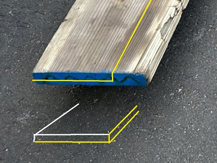 黄色ラインでカット 150x25x3900(2面古材面)をとる
