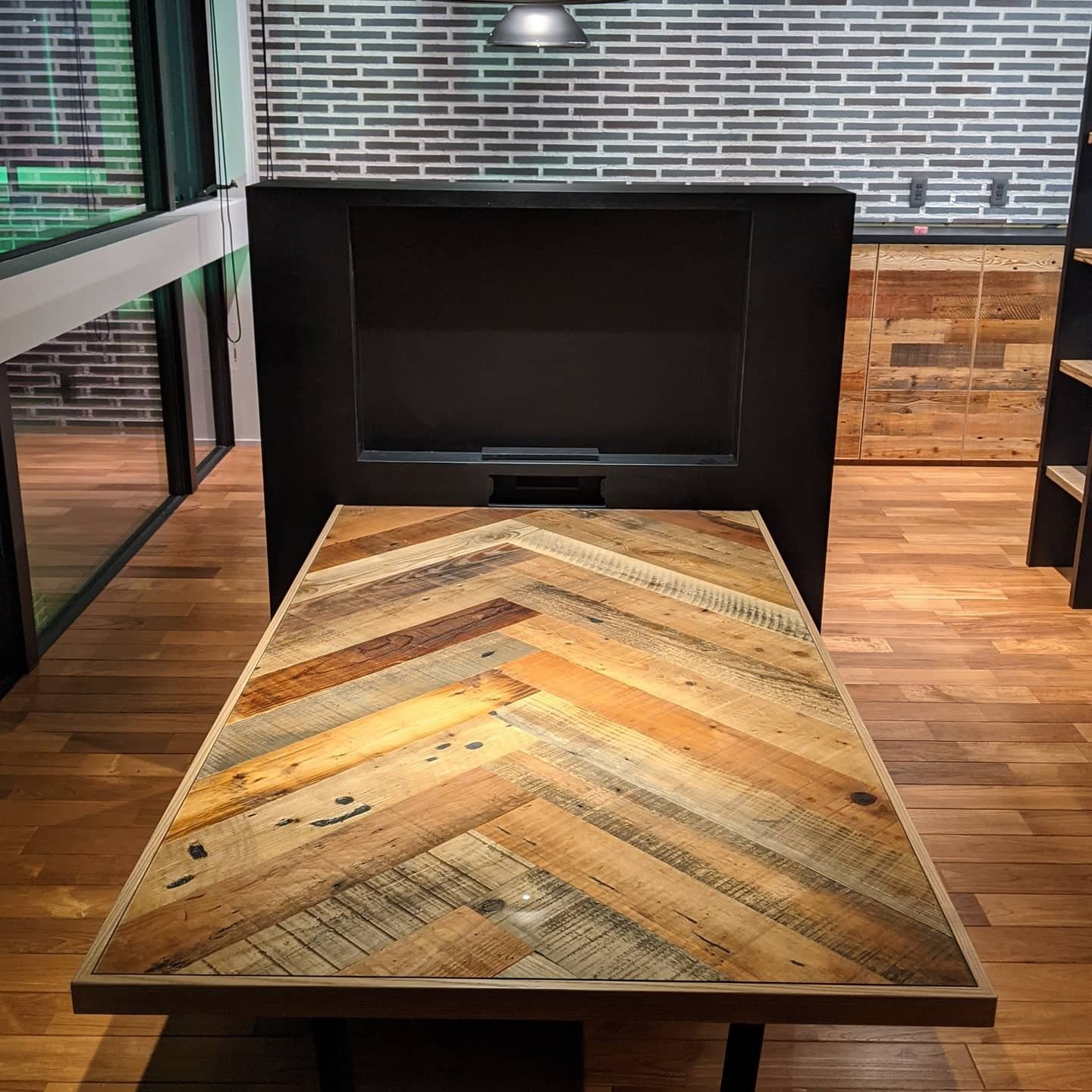 テーブル天板です。imondi Pineのヘリンボーンとランダム貼り。見え方も変化があって素敵です。