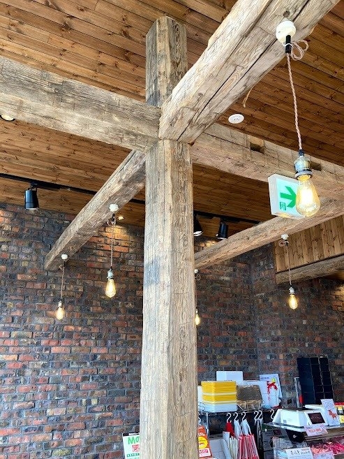 北米から入荷した角材です。最大の特徴は表面に施されたハンドヒューン(HAND-HEWN) つまり「手斧」の跡。その昔、機械が発達していないころ、丸太を手斧で一つ一つ手作業で仕上げて作りあげ角材です。この豪快な手斧の跡が北米の匠の力強さを感じさせます。