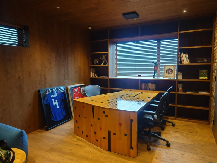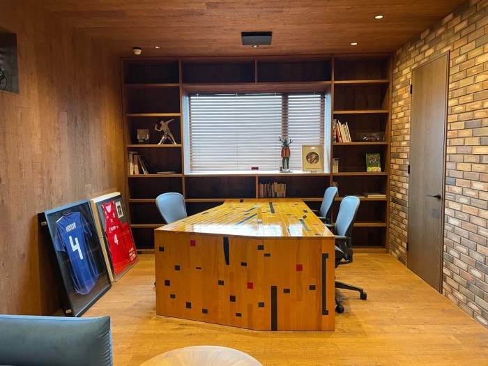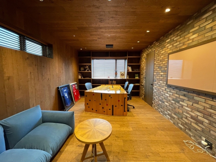 バスケットボールやバレーボールなど屋内スポーツが行われた体育館や運動施設から回収されたメープルフローリングです。カラフルなコートラインが空間に散りばめられ、軽快で遊び心のある外観を作り出します。
