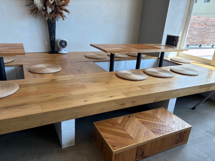オーク古材の表面からわずかに内部に入った部分を使用し、古材感を残しつつも上品に仕上げました。木目を浮き立たせ、さらにサンディング処理でなめらかさを持たせることにより古材でありながら手触りの良いフローリング材です。
