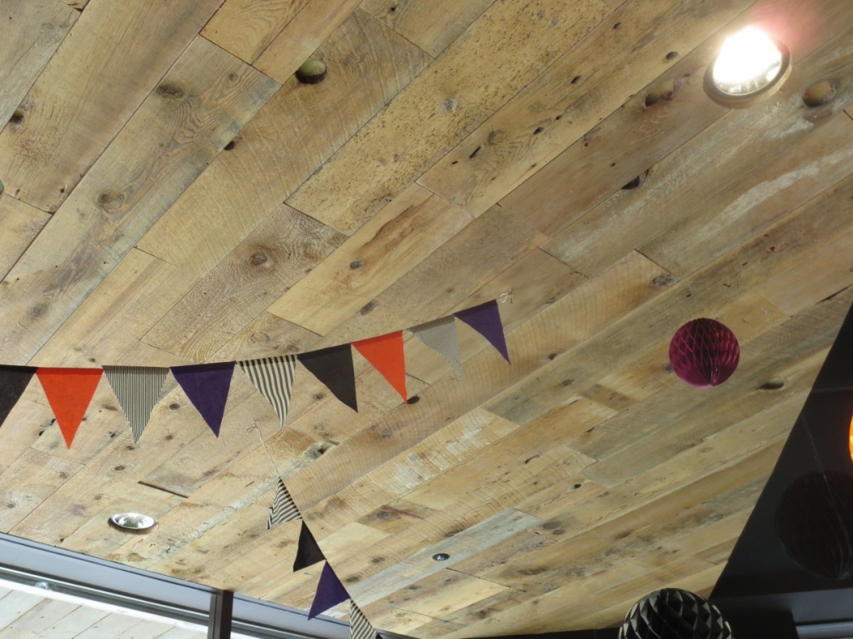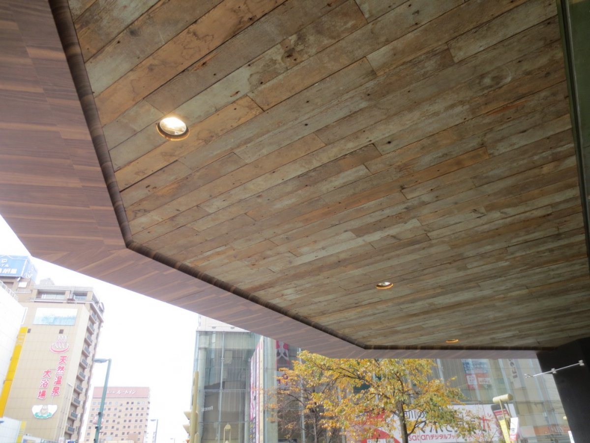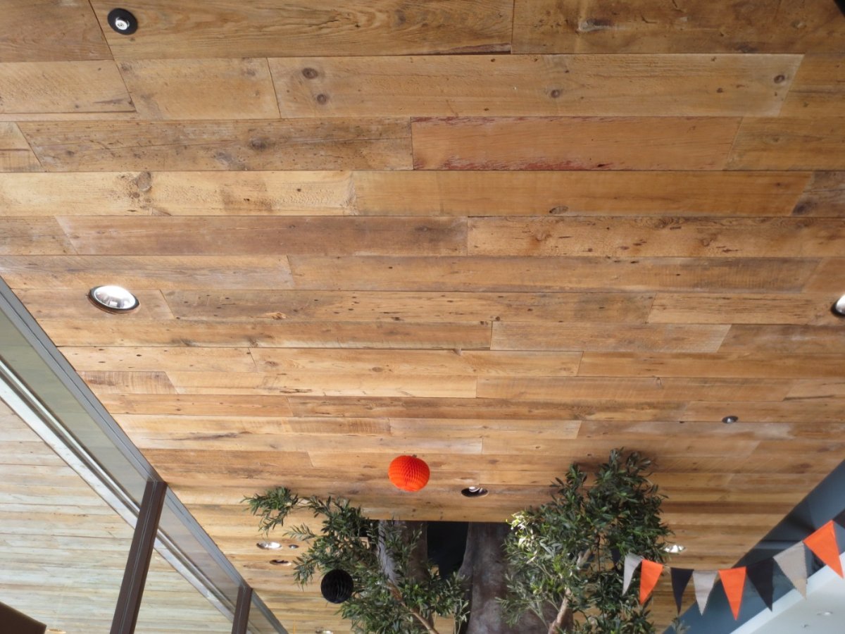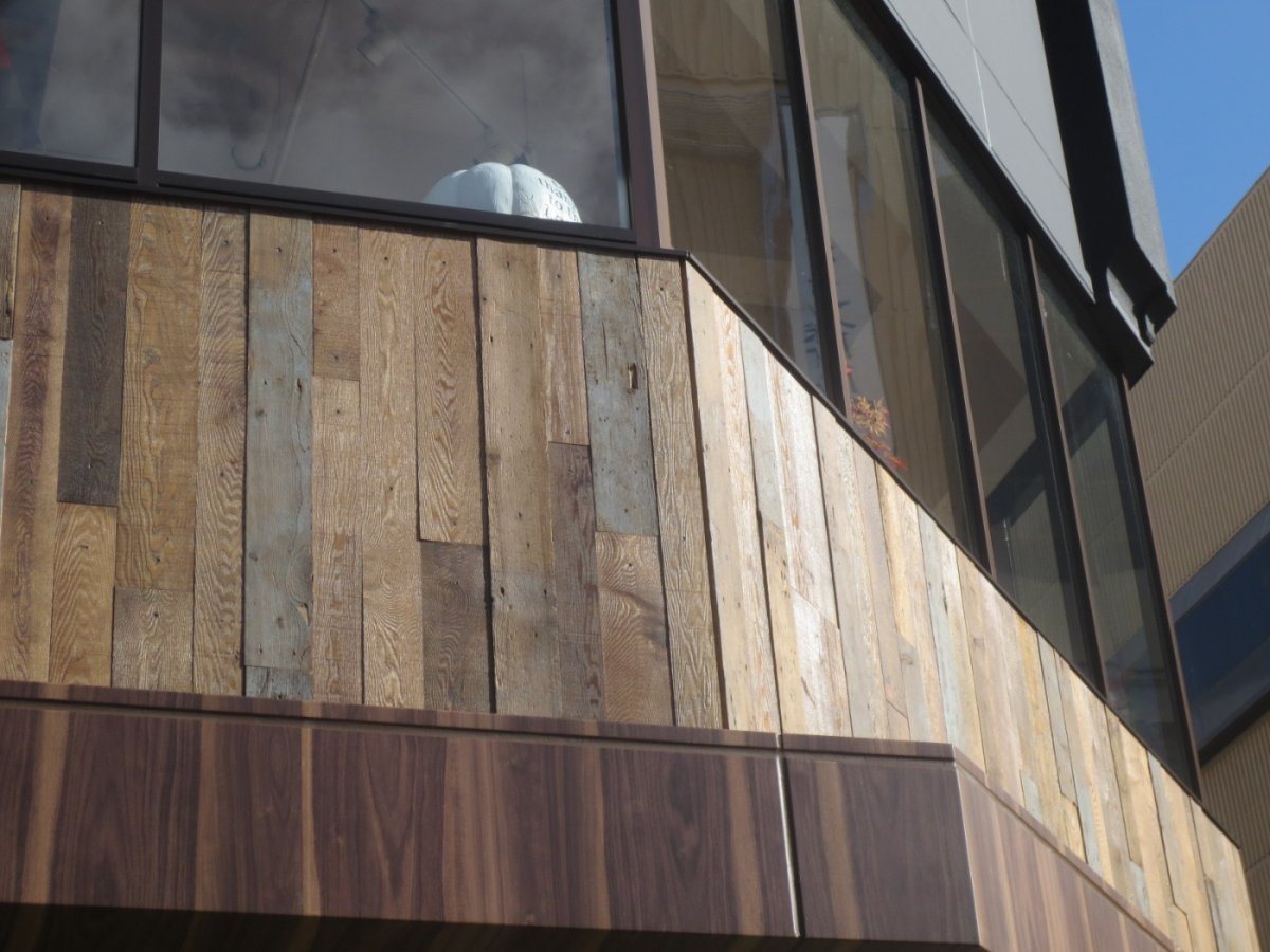 USボード ブラウンに不燃処理を施し、不燃材料として仕上げました。公共施設や百貨店・ショッピングモール・アーケード等の商業施設など、不燃材料の使用が義務付けられている場所においても古材を利用することができます。